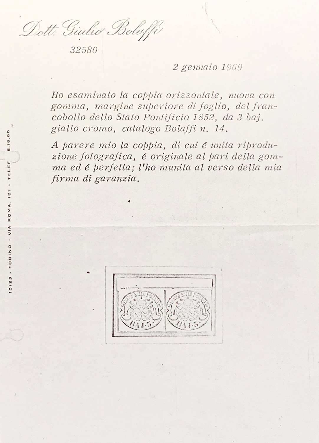 1854 - 3baj bistre orange upper sheet margin from "PONTECORVO", Papal States enclave Borbonico territory, to Roma, with oval postmark exceptionally used as only cancel on the stamps, and repeated at the back. Great rarity. Cert. E.Diena, Bottacchi and Mario Mentaschi postal report (Sassone 4+pt.R3 - Euro 52.500) (Image 1)(Image 2)(Image 3)(Image 4)(Image 5)(Image 6)