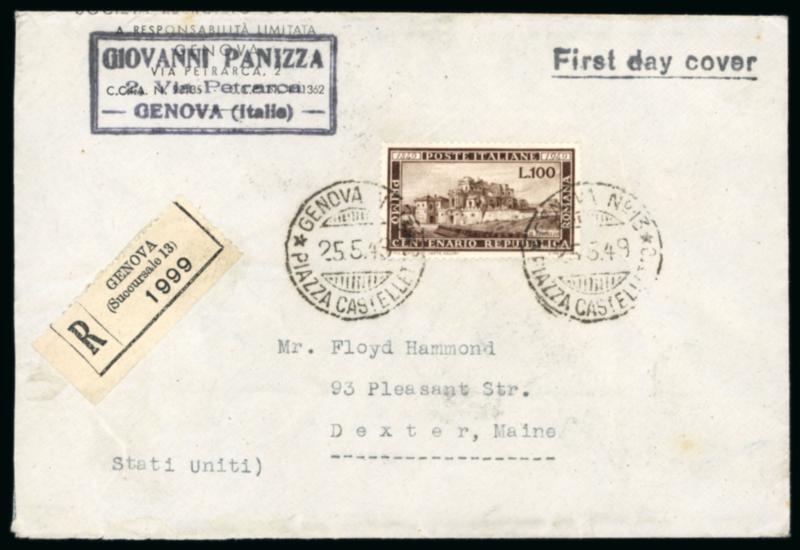 1949 (25.5.) registered cover to Dexter, Maine bearing single franking 100L Centenary of Republic tied two Genova N013 Piazza Castelleno cds, reverse with Genoa and New York transits and arrival cds (Jun 23), not used as a first day cover, fine condition (Image)