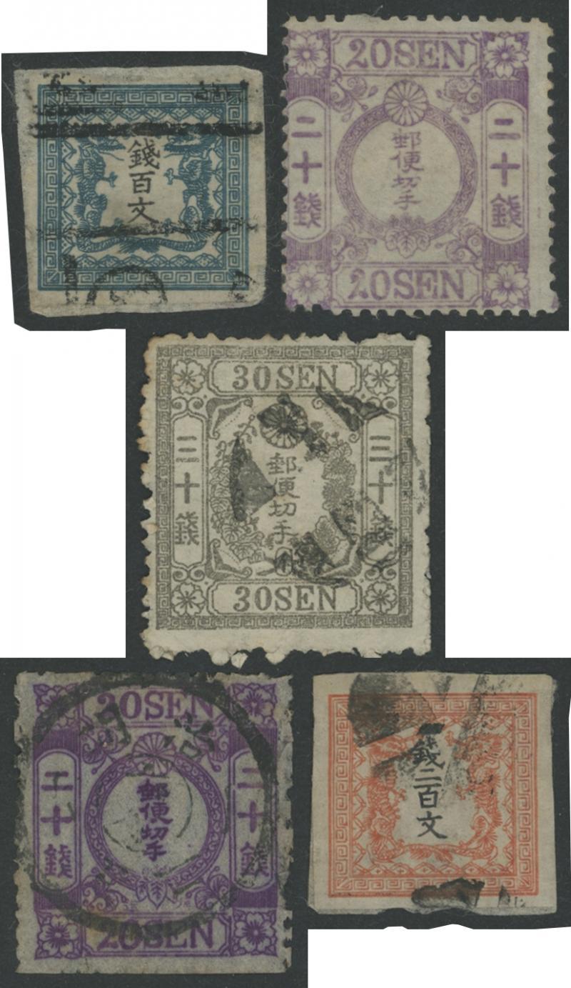 Selection of early issues with Dragons 100m & 200m on small pieces, 1872 Perf Dragons in mixed condition, 1872 Cherry Blossoms to 30s including 10s yellow-green, 20s lilac (unused; ISJP Certificate) and 20s aniline violet, etc; Japanese Post Offices in China mint/unused to 15s and used to 1y; and half a page of Ryukyus including 1950-58 set **. Only the one stamp expertised so offered 'as is'.