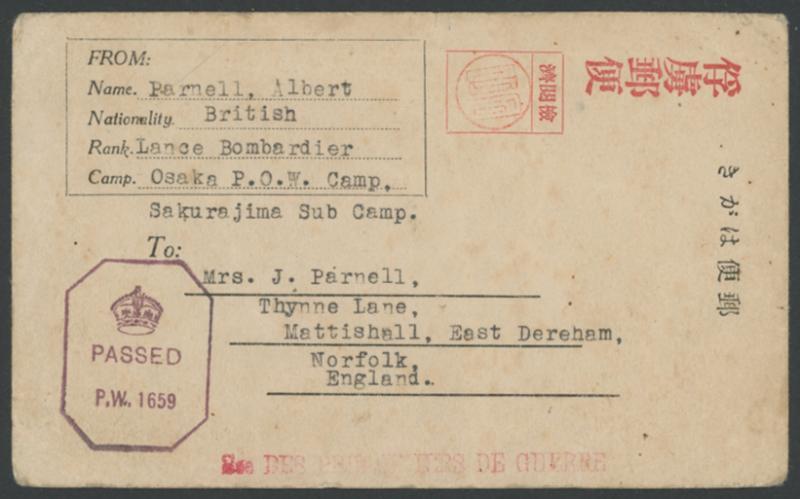 1942 Osaka (Sakurajima) Prisoner of War Camp, Honshu undated Japanese red & black/cream POW postal card with typed pro forma "letter" & "Osaka POW Camp/Sakurajima Sub Camp" at upper-left, han of Tomita, superb British censor in purple, light soiling & minor corner bend. The POWs worked at Osaka Dockyard. (Image1)