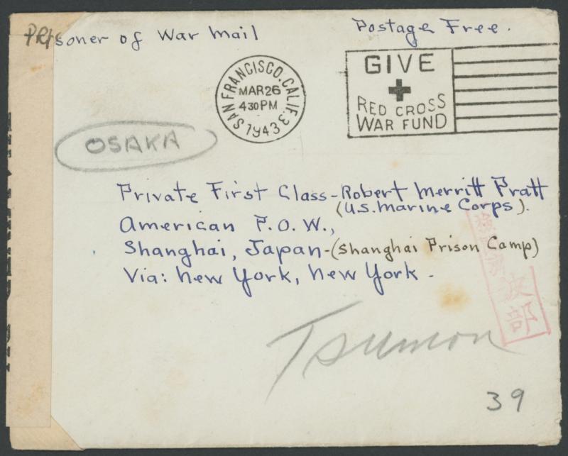 1943 (Mar 26) Osaka (Tsumori) Civilian Internment Camp, Honshu American cover with superb San Francisco machine with 'GIVE/ + /RED CROSS/WAR FUND' slogan, to a US soldier at "Shanghai, Japan" [sic] but endorsed "OSAKA" and "Tsumori", minor blemishes. Tsumori or Camp 14D was a civilian internment camp that held some POWs. (Image1)