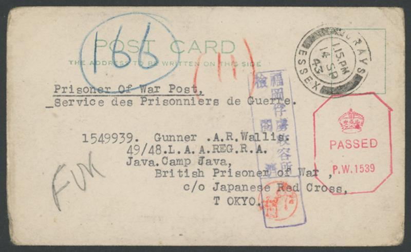 1943 (Sep 14) Fukuoka (Number 11) Prisoner of War Camp, Kyushu plain postcard from Essex to "Java Camp" with British censor, in Japan redirected to "FUK" Branch Camp "(11)" with Fukuoka censor in violet & unidentified han in scarlet, pencilled "Received 23.1.45" on reverse, bumped corners. The Japanese POW Research Network lists Fukuoka branch camps up to '27', but no '11', which presumably was absorbed into another camp. (Image1)