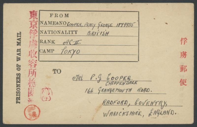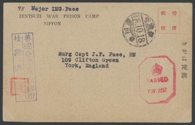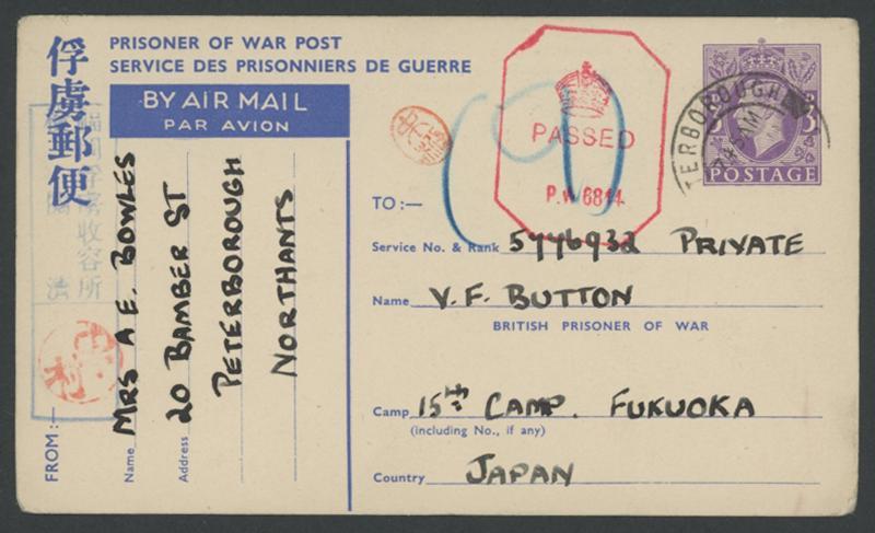 1944 Fukuoka (Miyata Number 9) Prisoner of War Camp, Kyushu British 3d POW Airmail Postal Card from Northamptonshire to "15th Camp Fukuoka" with British censor in rosine, Japanese censor in violet & han of Nakamura in scarlet, endorsed "9" for the Branch Camp with han of Motohashi in scarlet, received "25.2.45" in pencil on reverse, minor blemishes. (Image1)