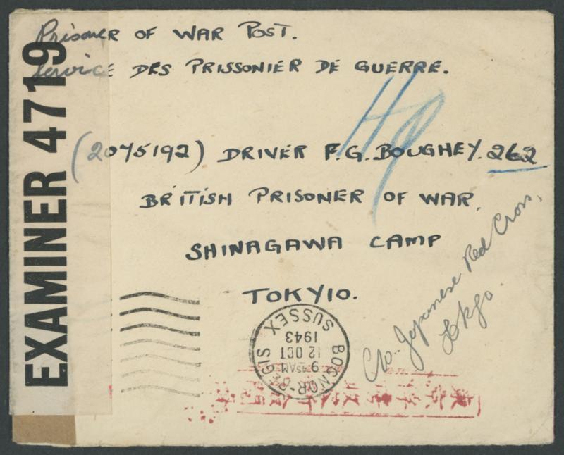 1943 (Oct 12) Shinagawa Hospital Camp stampless cover from Sussex with British censor label, Japanese censor cachet in red on both sides & on the enclosed letter which is roughly torn at the base (by the censor?) but unusually with no han, endorsed "HQ" in blue pencil. Driver Fred Boughey was captured in Hong Kong & spent time at Kowloon & Shinagawa Camps before transfer to Omori Camp where he was liberated. He was repatriated on HMS 'Speaker' in -.9.1945.