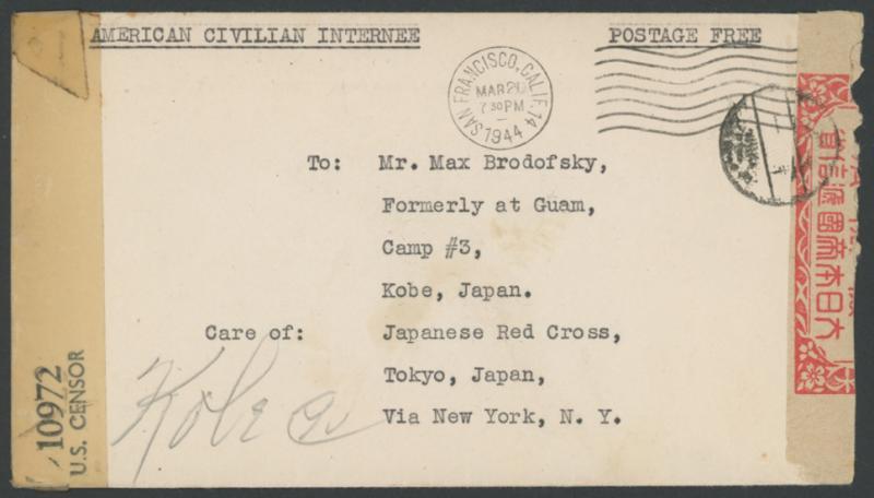 1944 (Mar 20) Kobe (Futatabi) Civilian Internment Camp, Honshu USA cover with San Francisco machine & clear censor tape, to a civilian "formerly at Guam/Camp No 3/Kobe", Japanese censor label & cds, pencilled "Kobe"; with the enclosed brief letter. The addressee, Max Brodofsky, had been the PanAm manager at Guam. Illustrated by David Tett in Volume 6 at page 98.