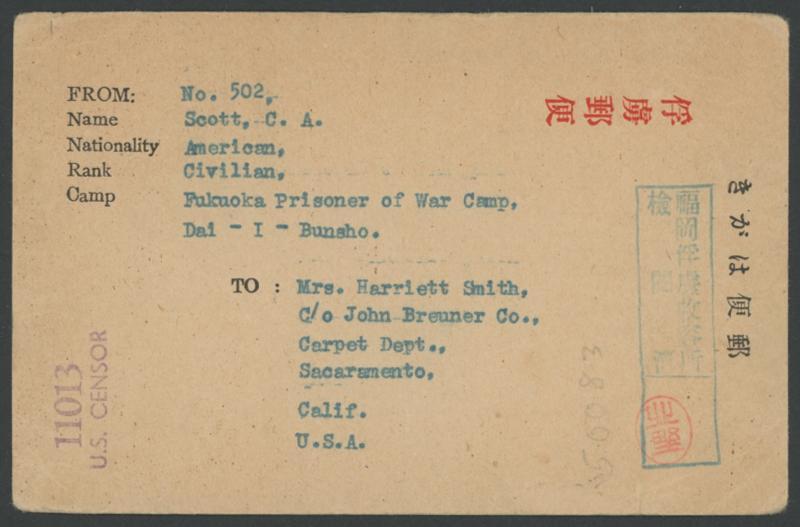 1944 (July) Fukuoka (Mizumaki Number 6B) Prisoner of War Camp, Kyushu simple Japanese POW postal card from an American civilian with light camp censor in violet, very fine han of Kitano in scarlet, on the reverse superb han of Sakamoto, minor defects. Prisoners were used by Takamatsu Coal Mining Co, where conditions were so bad that 74 POWs died. Two senior Japanese officers & one guard were later executed for war crimes. (Image1)