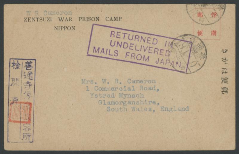 1944 (Nov) Zentsuji Prisoner of War Camp, Shikoku simple Japanese POW postal card with 'ZENTSUZI [sic] WAR PRISON CAMP/NIPPON' at upper-left, to Wales with camp censor in violet & unusual boxed han of Hosotani, unusually also with Japanese-language cds of 9.12.1944, largely superb strike of the boxed 'RETURNED IN/UNDELIVERED/MAILS FROM JAPAN' cachet in violet, minor imperfections. The cachet is ambiguous: it was meant to convey that this was part of the undelivered mails found in Japan. (Image1)