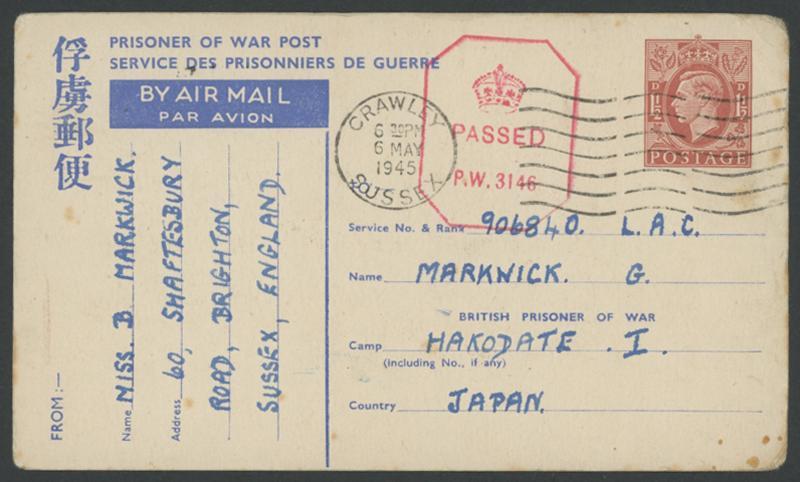 1945 (May 6) Hakodate Prisoner of War Camp, Hokkaido British 1½d red-brown POW Airmail Postal Card to "Hakodate I" with British censor in rosine but no Japanese markings, bumped corners & minor spots. Apparently delivered, probably after Japan surrendered. The POW's sister states "Hope you have heard the news" but doesn't say what it is (presumably the imminent surrender of Germany, on 8.5.1945). (Image1)