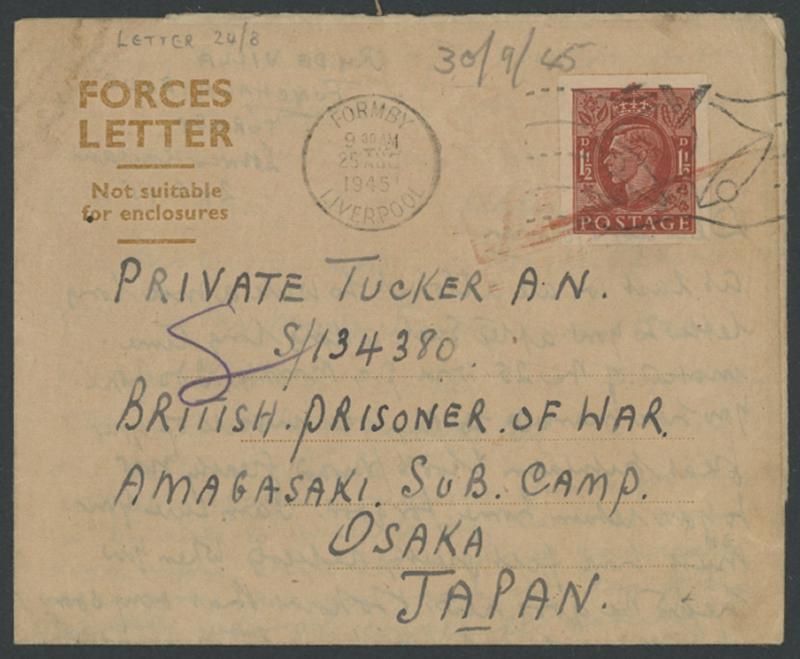 1945 (Aug 25) Osaka (Amagasaki) Prisoner of War Camp, Honshu British 1½d red-brown Forces Letter (aerogramme) to "Amagasaki Sub-Camp/Osaka" with full letter, pencilled "30.9.45" receival on the face. Posted after Japan surrendered so it's surprising that it was delivered to Japan. David Tett mentions Amagasaki only twice, with no details: it must have been a very small camp. (Image1)