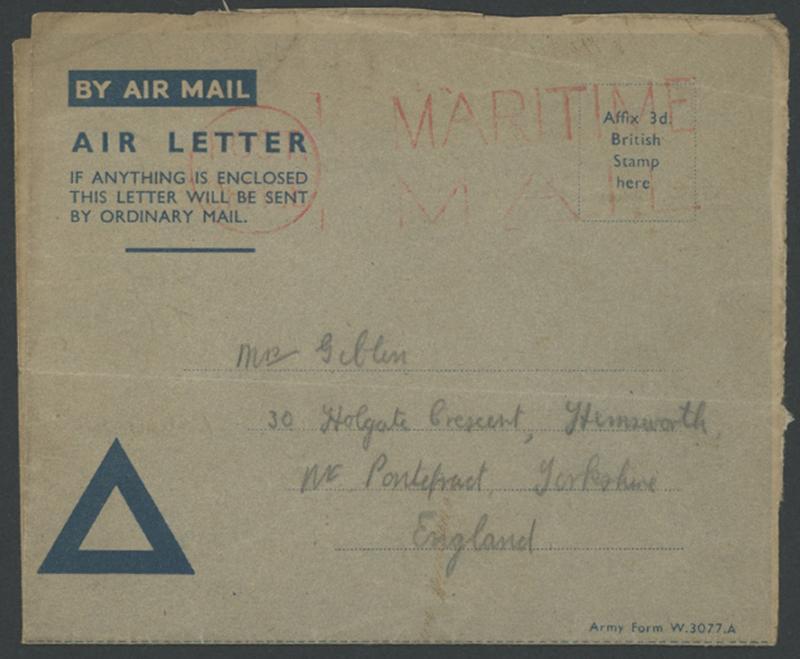 1945 (Sep 2; the date of the formal Japanese Surrender at Tokyo Bay) Tokyo (Omori) Prisoner of War Camp, Honshu British 'blue triangle' aerogramme with letter headed "HMS Speaker/Sept 2nd 1945", to Yorkshire, the only postal marking being British 'POST/OFFICE - MARITIME/MAIL' machine in red, a few folds. The writer, formerly held at Omori, states: "... I have survived to see this day of World Peace ... I was released by American soldiers on 29th August, the first camp relieved in Japan ... there are hundreds of my friends with their health ruined and many more dead ... I can never think of the Japanese race again without hating the very sound of their name ... life in Japan has qualified me to be a first class thief ..." David Tett in Volume 6 at page 334 lists the ships that repatriated POWs from Japan & elsewhere. He states the 'Speaker' departed from Manila 4.10.1945, arriving Brisbane 17.10.1945. This letter indicates that at least some POWs were on the ship from Tokyo. (Image1)
