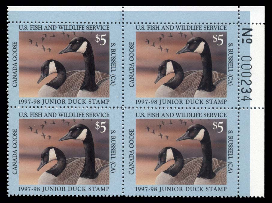JDS5, 1997 JUNIOR DUCK STAMP, UPPER RIGHT PLATE BLOCK OF 4, NO. 000234, VF NH, cv as four singles Cat($2,000) (Image)
