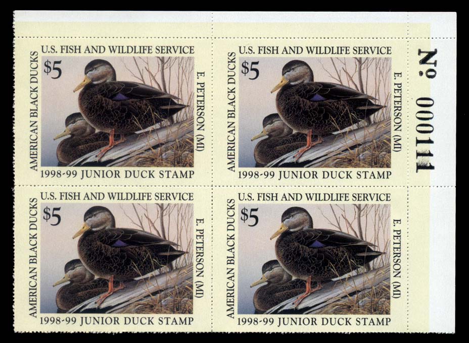 JDS6, 1998 JUNIOR DUCK STAMP, UPPER RIGHT PLATE BLOCK OF 4, NO. 000111, VF NH, cv is for four singles Cat($2,200) (Image)