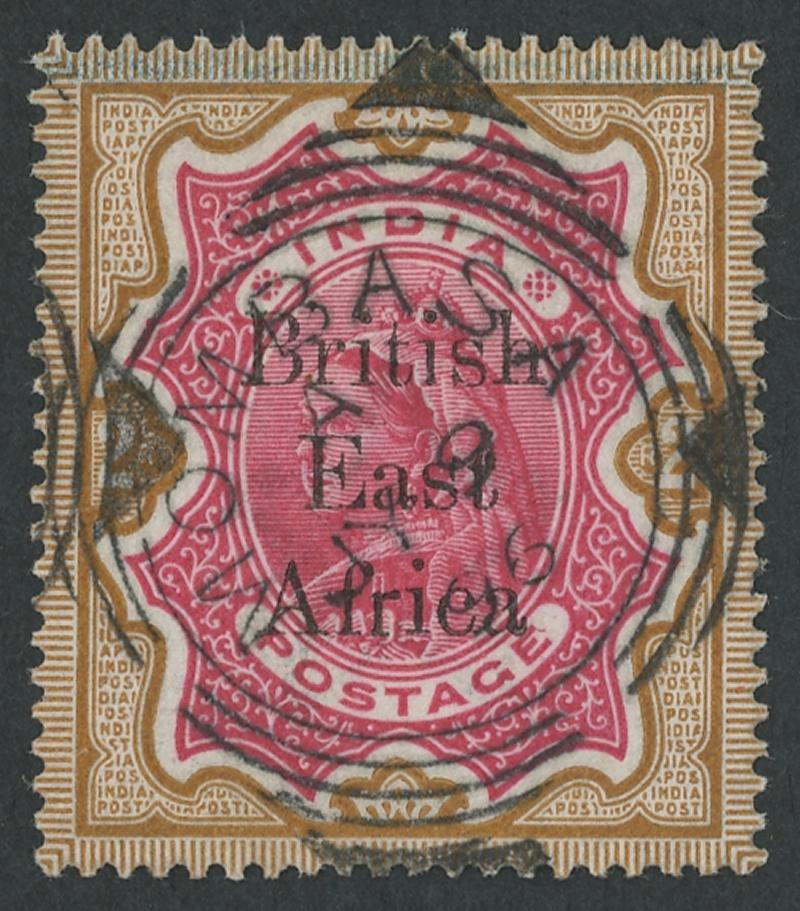BRITISH EAST AFRICA: 1895-96 Overprints on India 2r carmine & yellow-brown SG 61, well-centred, very fine complete 'MOMBASA/JY 9/96' Squared Circle cancel, Cat £250. (Image1)