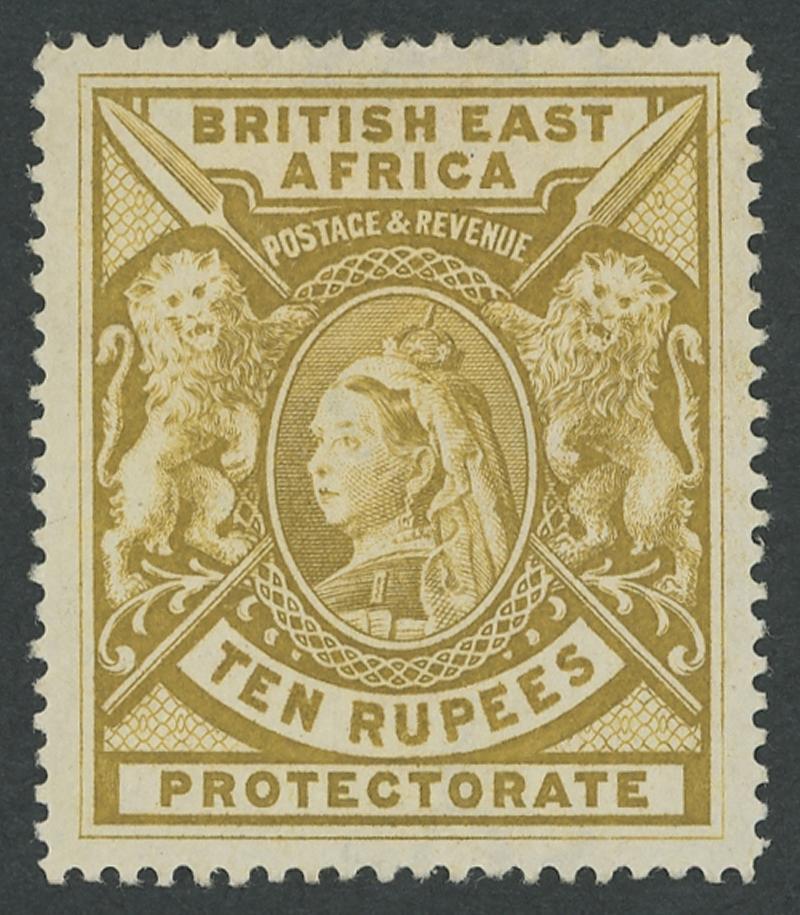 BRITISH EAST AFRICA: 1897-1903 QV High Values 10r yellow-bistre SG 97, well-centred especially for this issue, hinge remainder, Cat £650. (Image1)