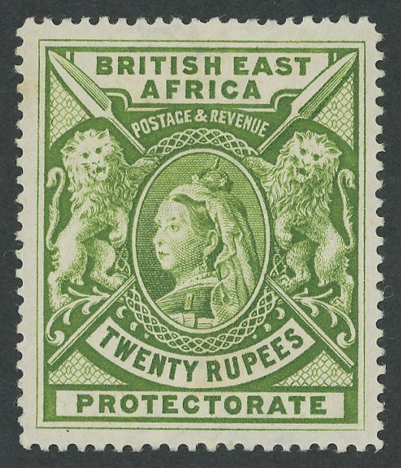 BRITISH EAST AFRICA: 1897-1903 QV High Values 20r pale green SG 98, bright fresh colour, well-centred especially for this issue, tiny aging mark on the reverse of one perf tip, small hinge remainder, Cat £1300. BPA Certificate (1975). (Image1)