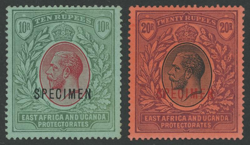 EAST AFRICA & UGANDA: 1912-21 KGV Keyplates Multiple Crown CA Wmk 1c to 20r black & purple/red with 'SPECIMEN' overprints SG 44s-59s, the 10r & 20r without gum, the others lightly mounted or with small hinge remainders, Cat £950 for the set of 17 (Gibbons includes the 20r purple & blue in their set, eventhough this was not issued until 1918).
