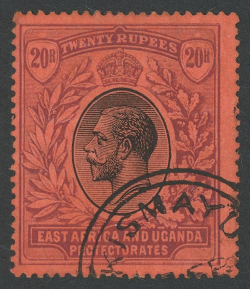 EAST AFRICA & UGANDA: 1912-21 KGV Keyplates Multiple Crown CA Watermark 20r black & purple/red SG 59, small-part very fine 'KISMAYU/[E.A.P]' cds cancel, Cat £600. Kismayu was the capital of Jubaland, which was ceded to Italy in 1925 (located in present-day Kenya). (Image1)