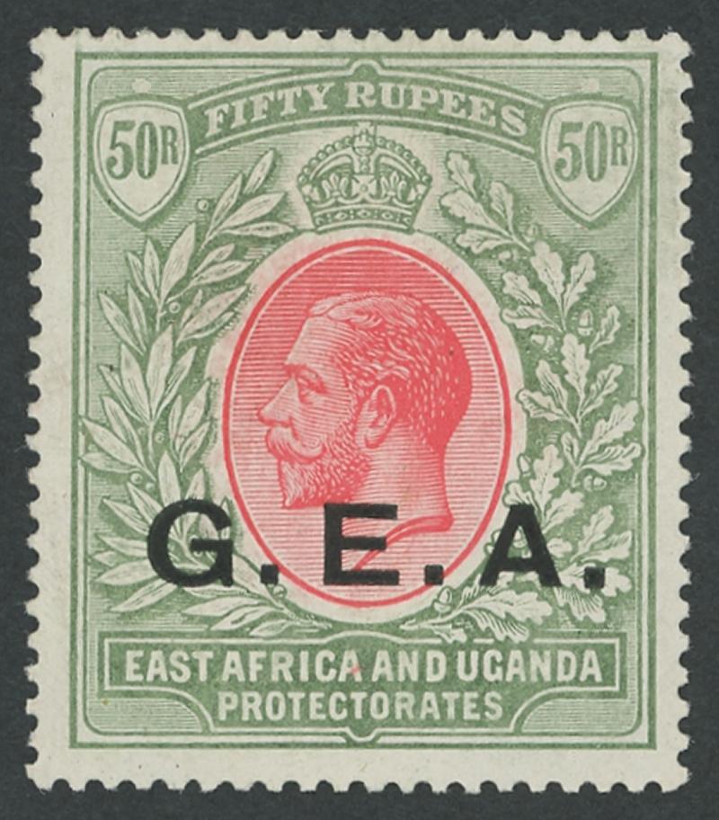 TANGANYIKA - BRITISH OCCUPATION OF GERMAN EAST AFRICA: 1917-21 'G.E.A.' Overprint on KGV Multiple Crown CA Wmk 50r carmine & green SG 62, very lightly mounted, Cat £750. (Image1)