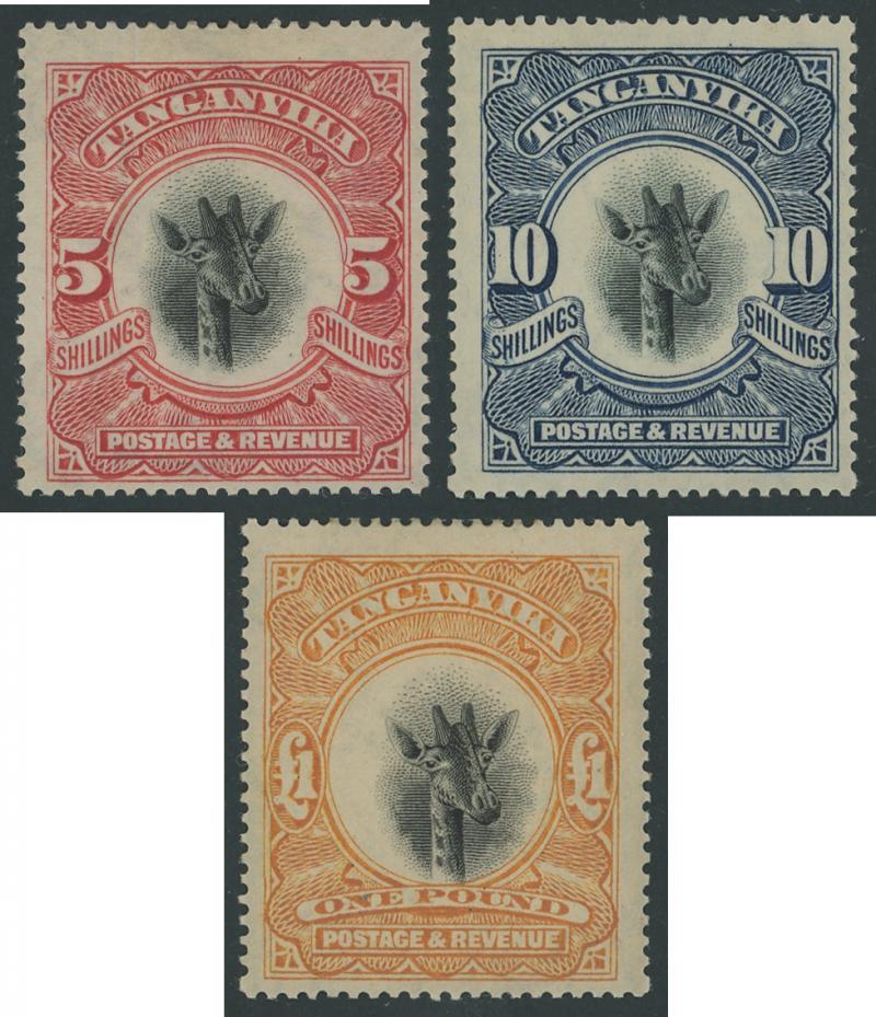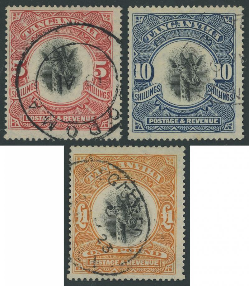 TANGANYIKA: 1922-24 Giraffes 1/- to £1 with the Watermark Sideways SG 83-88, characteristic wayward centring but the 1/- 3/- & 10/- are well-centred, light cds cancels on the lower values, the 5/- with very fine large-part 'DODOMA' double-ring, the 10/- & £1 with partial registered ovals, Cat £1870.