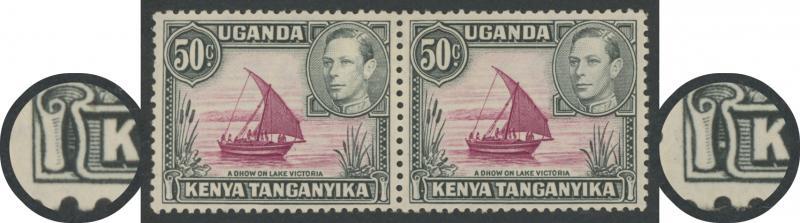 1938-54 KGVI Pictorials 50c purple & black horizontal pair the right-hand unit with Scroll Dot at Lower-Left the left-hand unit without SG 144eb, quite well-centred, a little very light gum tropicalisation, unmounted, the right-hand unit with a tiny gum disturbance, Cat £550. [The Scroll Dot was retouched before the June 1950 Plate 3 printing; on five stamps this was overlooked, and on some others the retouching was not completely effective, leaving traces as can be seen on the left-hand unit] (Image1)