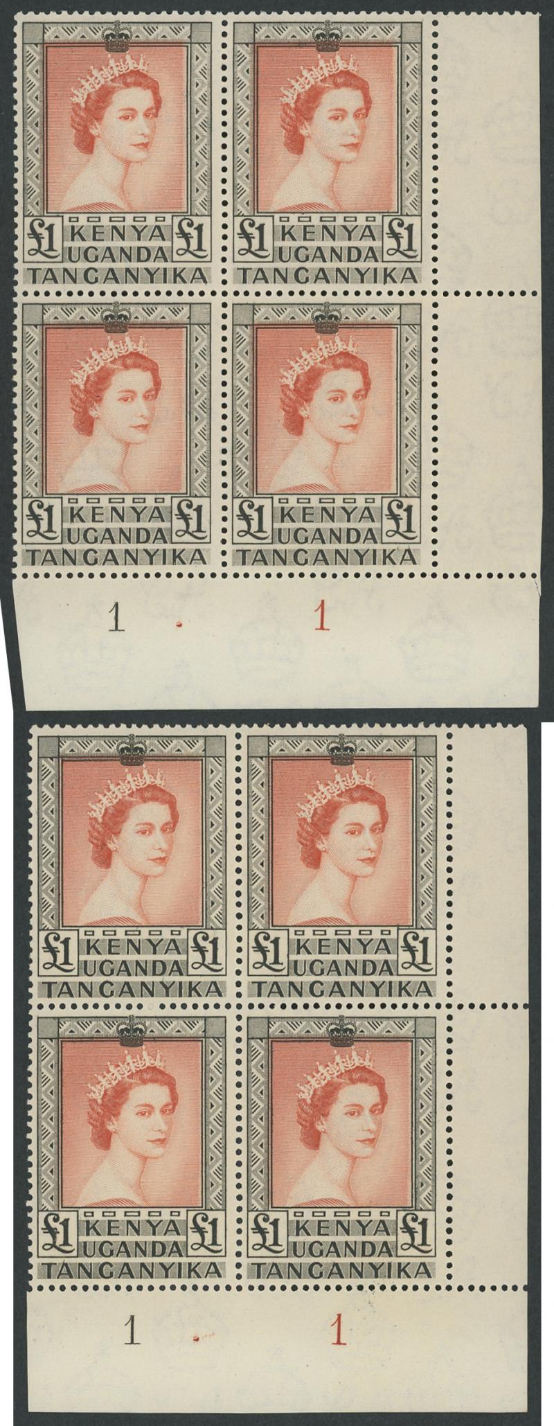 1890s-1960s extensive collection predominantly mint from British East Africa 1890-95 Light & Liberty set including 8a blue Imperforate single (minor toning) and '5/ANNAS' surcharge plus used range including 2r x2, 4r & 5r x2, 1895 'British/East/Africa' handstamps 3r used & 4r unused, 1895-96 Overprints on India set, 1896-1901 QV Small Heads set * plus 5r brown used & 'SPECIMEN' overprint, 1897 Overprints on Zanzibar set *# and 1897-1903 QV Large Heads 1r blue, 2r orange & 5r red (the latter with a couple of small aging marks); East Africa & Uganda 1904-07 KEVII Keyplates Multiple Crown CA Wmk set to 5r plus 2r used, 1907-08 New Currency set plus 'SPECIMEN' overprints, KGV Keyplates Crown CA Wmk set to 10r plus 1r emerald back, 2r, 3r & 4r used and 3r 'SPECIMEN' overprint, and Script CA Wmk 2r 3r & 5r; Kenya & Uganda KGV Heads 5/- 7/50c & 10/- * and 2/50c 4/- & 5/- used plus 10/- £1 & £5 with fiscal cancels; Tanganyika 1917-21 'GEA' Overprints set to 5r * plus 2r used, 1922-24 Giraffes range to 3/- used & 5/- *, and KGV Keyplates set plus 5/- used x2; Uganda 1896 Typeset 1a & 4a unused and 1r used, 1898-1902 QV set * & used (ex 3a) plus shades including 8a green * & used and 1r bright blue * plus 1r & 5r 'SPECIMEN' overprints; KUT 1935-37 KGV Pictorials 5c Rope Joined to Sail block of 4 plus 3/-, 10/- & £1 used, 1938-54 KGVI Pictorials set plus extra perfs & shades */** including Perf 13¼ 15c, 20c, 30c, 2/-, 5/- & 10/- x2, Perf 14 10c, 20c, 30c, 2/-, 5/- & 10/-, Perf 13x11¾ 50c block of 4 the lower-left unit Rope not Joined to Sail, 3/- x2 shades & £1, 5c, 10c, 15c & 20c booklet panes, blocks of 4 including 50c x2 (one including Rope Not Joined to Sail variety) & £1 x3 plus a range of used, 1948 Silver Wedding £1 plate number corner block of 4 **, 1954-59 QEII Pictorials set with extra shades */**, 'OFFICIAL' overprints 1959 set ** & used, Postage Dues; and Kenya 1963 Independence set in Plate Number blocks of 4 **; Tanganyika/Tanzania and Uganda post-independence issues, etc; a few with some minor againg marks/gum tropicalisation but generally fine to very fine, Cat £15,000+.