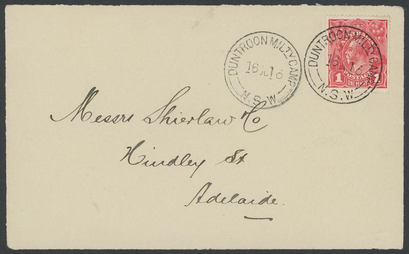 1916 (June 16) Shierlaw envelope (front only) with KGV 1d red tied by very fine complete strike of the very scarce 'DUNTROON MILTY CAMP/=NSW=' cds with another complete strike alongside. PO 22.3.1916; closed 20.12.1916; re-opened 1.2.1917; closed 7.2.1918. [Australian Capital Territory]