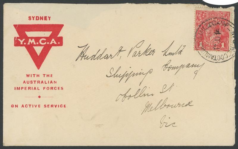 1916 (June 17) Sydney YMCA with the Australian Imperial Forces red 'Inverted Triangle' envelope to Melbourne with KGV 1d red tied by largely very fine almost complete strike of the very scarce 'COOTAMUNDRA MILTY CAMP/=NSW=' cds, small closed tear at upper-left & minor edge faults with small part back flap missing. PO 15.5.1916; closed 25.11.1916.