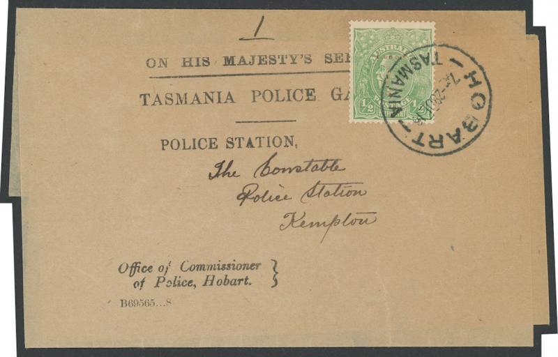 1916 (June 28) Tasmania Police Gazette OHMS wrapper to "The Constable, Police Station, Kempton" (Tas) with scarce solo franking of KGV ½d green punctured 'T' tied by Hobart cds, minor blemishes on reverse otherwise very fine. The printed matter rate was ½d per 2oz.