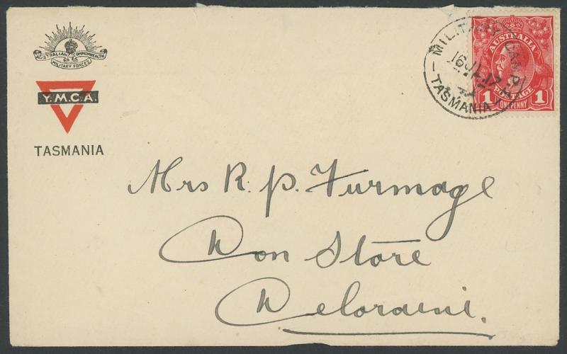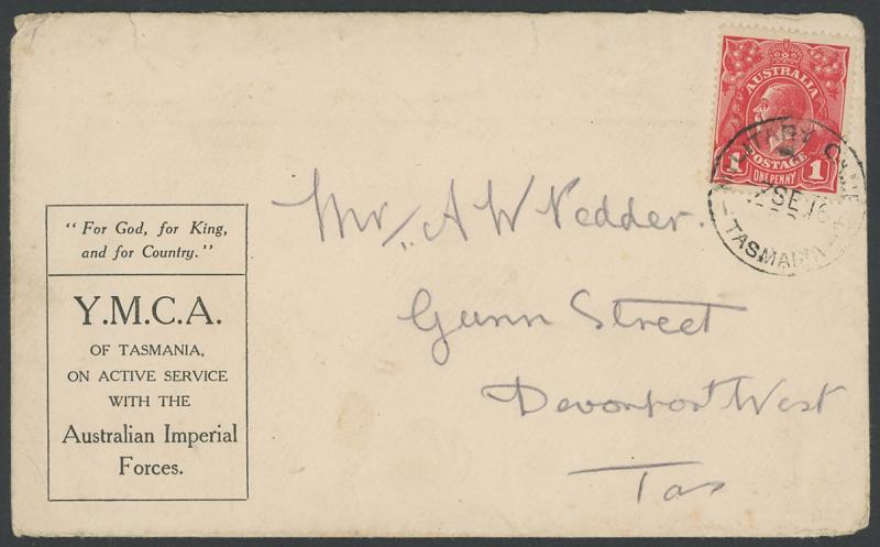1916 (Sept 7) YMCA of Tasmania on Active Service with the Australian Imperial Forces envelope to West Devonport with KGV 1d red tied by fine complete strike of 'MILITARY CAMP 1/ TASMANIA' cds used at Claremont Military Camp, a few minor edge faults at top. PO 23.10.1914; closed 22.11.1918.