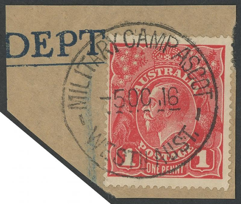 1916 (Oct 5) KGV 1d red tied to small piece by very fine to superb complete strike of the very scarce 'MILITARY CAMP ASCOT/28OC15/WESTN AUST' cds. PO opened at Belmont Park Racecourse late-1915; closed -/2/1917. A slightly lesser strike on defective cover sold at our auction of 28.2.2023 for $324.