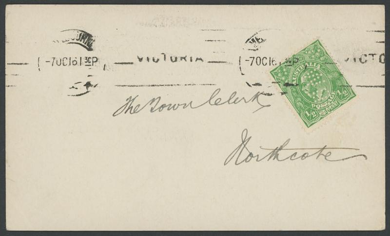 1916 (Oct 7) Melbourne & Metropolitan Board of Works notification postcard to Northcote with ½d green 'MBW' commercial perfin solo tied by Melbourne machine cancel, a couple of minor corner bends. The rate was ½d printed matter; the postcard rate was 1d.