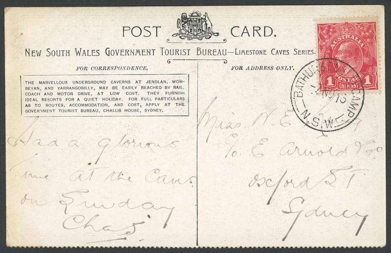 1916 (Nov 7) NSW Government Tourist Bureau PPC ('The Indian Chamber, Orient Cave, Jenolan Caves') to Sydney with KGV 1d red tied by largely very fine complete strike of the scarce 'BATHURST MILTY CAMP/=NSW=' cds, minor blemishes. PO 1.5.1916; closed 2.12.1916.