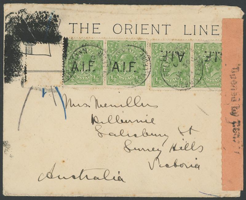 1916 (circa) Orient Line of Royal Mail Steamers envelope to Victoria posted by an Australian serviceman on board troopship with 'A.I.F./Passed by Censor No. ["6081"]' cachet (number added in blue pencil) and KGV ½d green 'A.I.F.' Overprint pair affixed but not cancelled, the cover with minor edge faults & the left-hand stamp with perf faults at upper-right. [These private unauthorised overprints were purportedly 'issued' for use on troopship and military mail, but did not have any postal validity. From February 1915 onwards, Australian servicemen overseas were afforded free letter (up to 4oz) postage privilege, so no action was taken in respect of the bogus overprints. [See also Lots 582, 583 & 593 below]