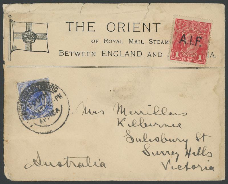 1917 (Jan) The Orient Line of Royal Mail Steamers illustrated 'Flag' envelope to Victoria presumably posted by an Australian serviceman on board troopship with KGV 1d red 'A.I.F.' Overprint affixed but not cancelled, the cover off-loaded en route with South Africa KGV 2½d blue added tied by 'PIETERMARITZBURG/12JA17' cds, a few mostly minor edge faults & marks and a small part of the back flap missing.