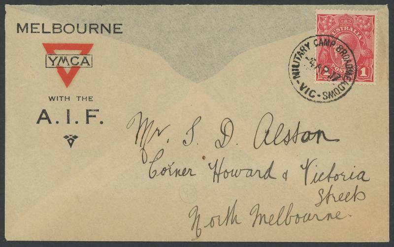1917 (April 4) flimsy envelope with Melbourne YMCA with the AIF red & black logo, to South Melbourne with KGV 1d red tied by very fine complete 'MILITARY CAMP BROADMEADOWS/VIC' cds, back flap missing otherwise very fine. PO 17.8.1914; closed 19.3.1919.