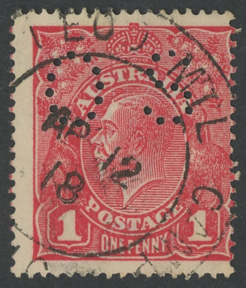 1918 (April 12) KGV 1d red punctured 'OS' with largely very fine large-part strike of the rare '[MC] LEOD MIL CAMP/[V]IC' double-circle skeleton relief cds. Macleod Military Camp PO 3.4.1918; renamed Mont Park circa 1923. The only recorded date for this postmark. [The implement comprised a collar into which moveable type was inserted, often resulting in Inscriptional errors]