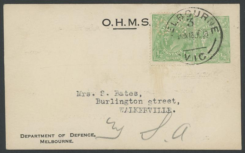 1918 (July 16) usage of KGV Sideface ½d green Stamped-to-Order Postal Card ACSC PS5 with 'DEPARTMENT OF DEFENCE/MELBOURNE' imprint at lower-left, to Walkerville with manuscript "try SA", unnecessarily uprated with KGV ½d green punctured 'OS' tied by Melbourne cds, a couple of very minor blemishes, Cat $600. The Printed Matter rate was ½d, but it seems the 1d Commercial Papers rate was inadvertently paid. [The illustration is above Lot 590]