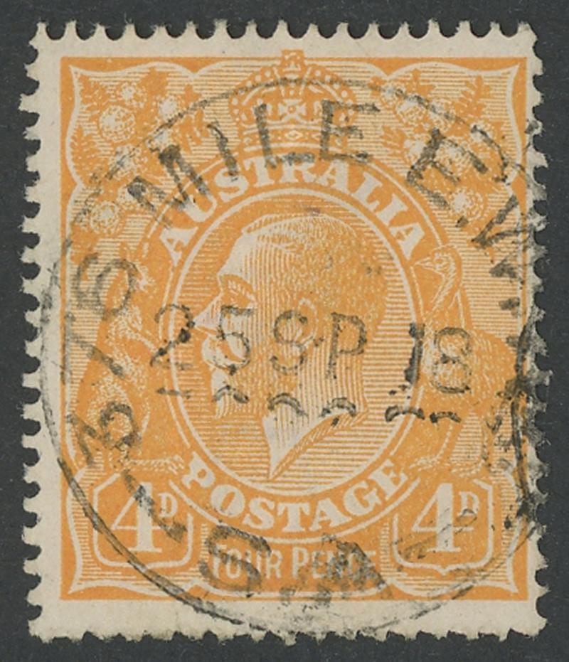 1918 (Sept 25) KGV 4d orange with very fine largely complete strike of '376 MILE E.W.RLY/S.A' cds (rated RRRR). PO 19.9.1916; closed 1918. [Station on the Trans-Australian Railway at the site of present-day Barton. The PSSA states that the office closed May 1918, but several later strikes to 26OC18 are recorded]