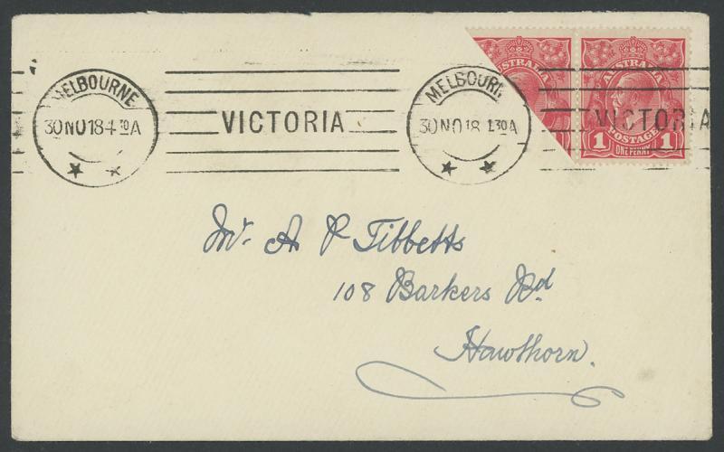 1918 (Nov 30) apparently commercial cover to Hawthorn with KGV 1d red pair - the left-hand unit an unauthorised diagonal bisect - tied by Melbourne machine cancel. In the weeks after the ½d war tax was introduced on 28.10.1918, the Post Office turned a blind eye to bisected 1d stamps. Tillie Mitchell's Kangaroo 1d bisect cover - posted a few days later - sold at our auction of 29.8.2020 for $1180.