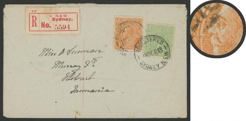 1918 (Dec 19) to Tasmania with KGV ½d green & 4d orange with Broken Shading in front of King's Nose [Pos 2R15] tied by Sydney 'REGISTERED' cds with red/white R label alongside, Hobart '21DE18' arrival backstamp, a little roughly opened on the back & a few blemishes. The rate was 1d letter plus 3d registration fee plus ½d War Tax (introduced 28.10.1918).