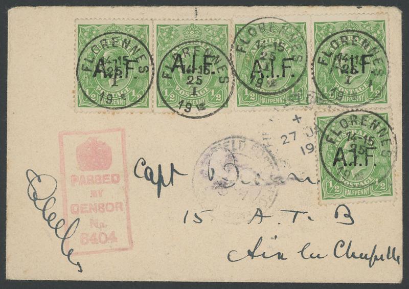 1919 (Jan 25) Australian serviceman in Belgium cover to "Aix le Chapelle" (now Aachen, Germany) with KGV ½d green 'A.I.F.' Overprint x5 tied by very fine strikes of 'FLORENNES' cds, censored with British 'PASSED/BY/CENSOR/NO./6404' handstamp in red on face, indistinct British Field Post Office '27 JA/19' arrival also tying three of the stamps, very fine. These private unauthorised overprints were purportedly 'issued' for use on troopship and military mail, but did not have any postal validity. From February 1915 onwards, Australian servicemen overseas were afforded free letter (up to 4oz) postage privilege. This may not have extended to mail sent from a Belgian post office, which appears to have accepted the franking as legitimate. See also Lots 567, 582 & 583 above.