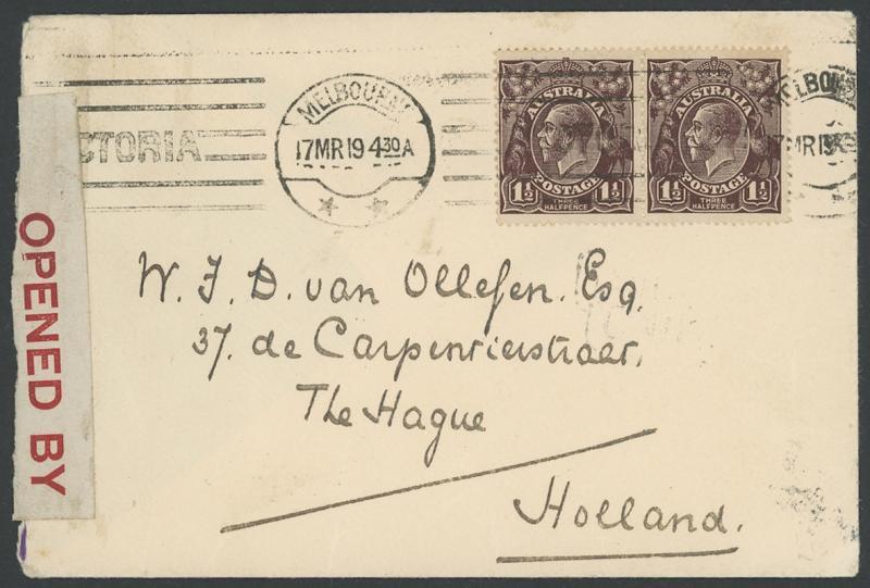 1919 (March 17) to Holland with KGV 1½d black-brown horizontal pair tied by Melbourne machine cancel, censored with Melbourne 'OPENED BY/CENSOR' red/white resealing label at left, s'Gravenhage '30.4.19' arrival backstamps, a couple of minor marks. The rate was 2½d foreign letter plus ½d War Tax (introduced 28.10.1918).