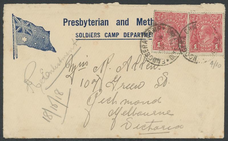 1919 (Oct 9) Presbyterian and Methodist Soldiers Camp Department 'Australian Flag' illustrated envelope to Melbourne with KGV 1d red x2 tied by largely very fine complete strike of 'ENOGERRA CAMP/QUEENSLAND' cds, a few mostly minor blemishes. PO -.3.1915; closed -.10.1918.