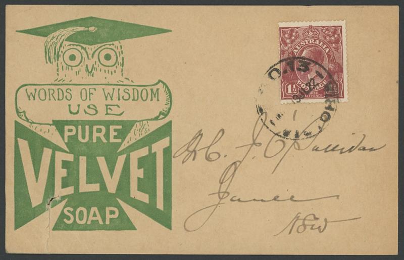 1922 (July 19) J Kitchen & Sons '[Owl wearing mortar-board & holding a bar of soap] Words of Wisdom Use Pure Velvet Soap' illustrated advertising postcard to Junee (NSW) posted directly onto train with KGV 1½d brown tied by partly-indistinct 'T.P.O 13/DOW[N] 19JL22/VICTORIA' cds used on the Melbourne-Wodonga Line, closed 20mm tear at lower-left where removed from spike. Molnar & Waugh (2015) state that "only one cover has been reported, though its veracity has not been confirmed ... If it does exist, it would have a unique rating". The direction of travel away from Melbourne confirms the 'DOWN' even though the strike is indistinct. We are unsure whether this is the 'cover' to which the authors refer.