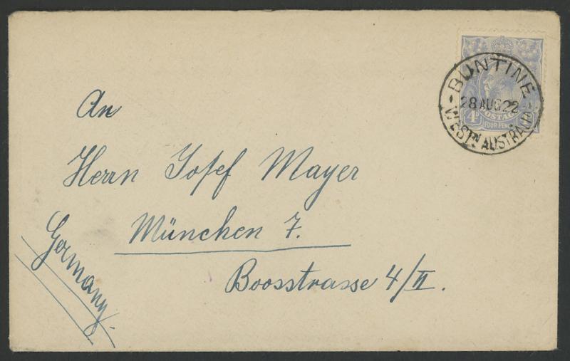 1922 (Aug 28) to Germany with KGV 4d blue solo franking tied by largely very fine 'BUNTINE/WESTN AUSTRALIA' cds, Cat $125 on cover. The rate was 4d per 1oz foreign letter (introduced 1.1.1922). Buntine PO 1.3.1915 [Farming; 19km NNW of Wubin]