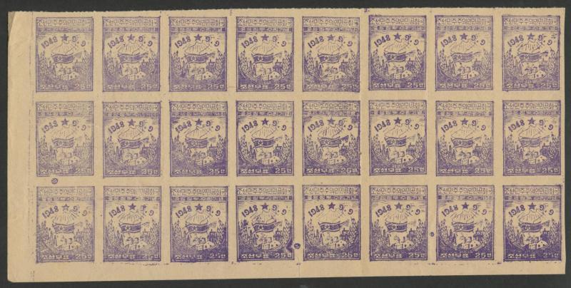 NORTH KOREA: 1948 Flag 25ch violet Scott #14 block of 24 (8x3), 1949 Flag 50ch #16 complete sheet of 100 (10x10), ungummed as issued, Cat US$760+ for singles; plus large blocks & large-part sheets of five other values to 500wn that are not listed by Scott or Gibbons and that we expect are Revenues.
