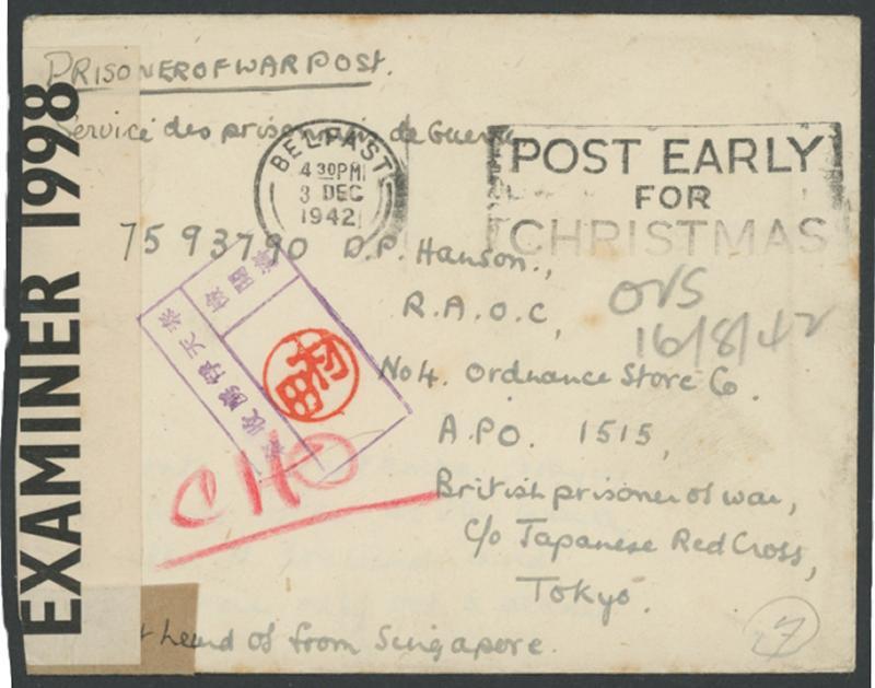 1942 (Dec 3) Japanese Occupation Jinsen (Number 1) Prisoner of War Camp cover with 'POST EARLY/FOR/ CHRISTMAS' slogan of Belfast endorsed "last heard of from Singapore" with British censor label, at Changi endorsed "OVS 16.8.42" (= Overseas, the date being when POWs from Changi were sent to Japan) & "CHO" (= Chosen) in red-pencil, Japanese censor in violet & superb han of Murata in scarlet, faint spotting on the reverse. The enclosed letter heavily censored with a portion cut-out & two other lines obliterated, some staining.