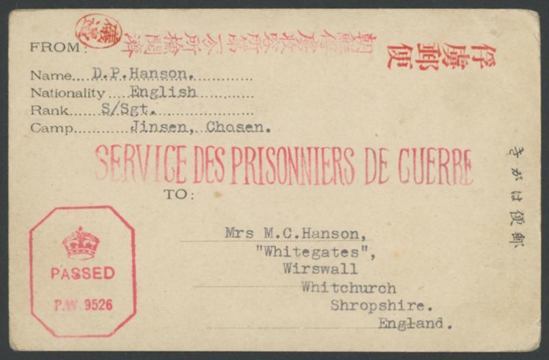 1944 (Nov) Japanese Occupation Jinsen (Number 1) Prisoner of War Camp Japanese simple POW postal card with huge 'SERVICE DES PRISONNIERS DE GUERRE' & Camp censor both in rosine with han of Isobe in scarlet, typed "Jinsen, Chosen" at upper-left & on the reverse "Transferred to Mukden POW Camp on 9.11.42", British censor in rosine, slightly bumped corners. Illustrated by David Tett in Volume 6 at page 125 where he states the card was posted in Korea immediately before Sgt Hanson was transferred to Manchukuo. (Image1)