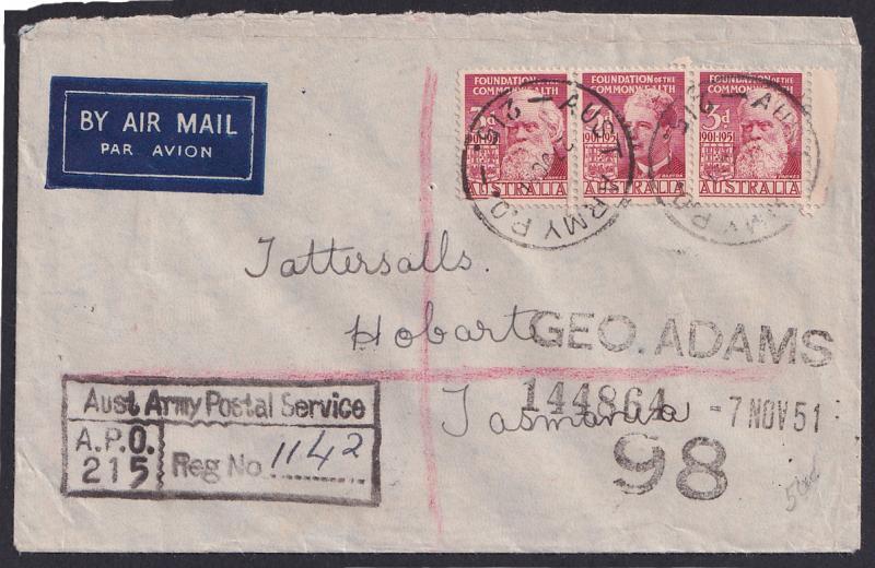1950s Australian Forces in the Korean War covers including with KGVI 3d green pair tied by British 'FIELD POST OFFICE/158' cds; to GB with QM 2d tied by 'NZAPO/FPO - 2' cds; and registered trio at 9d (Federation 3d se-tenant strip of 3) or 1/- x2 with rubber R cachets of APO 214, APO 215 or UPS 388.