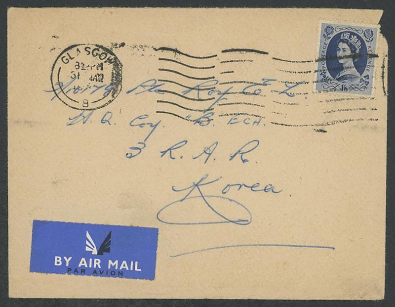 1954 (March 31) inwards airmail to "3 RAR, Korea" (3rd Royal Australian Regiment) with GB QEII 1/6d tied by Glasgow, machine, superb 'AUST UNIT POSTAL STN/11JE54/ 495 ' arrival used at 3RAR HQ in Korea, minor faults. Inwards mail to Korean War servicemen is scarce. (Image1)